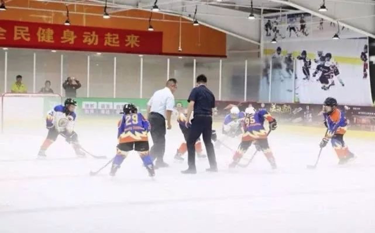活動(dòng)現(xiàn)場(chǎng)一隊(duì)活力四射的小學(xué)生展開了一場(chǎng)精彩的冰球?qū)官?